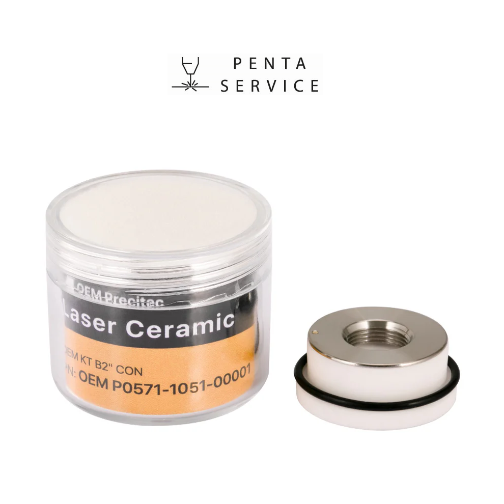 Керамическая проставка (держатель сопла) KT B2, артикул LC03D28PT1051, вид конусообразный. Применяется в лазерных станках и оптических лазерных головках PRECITEC®, SALVAGNINI®, RAYTOOLS®, BODOR®, WSX®, AU3TECH®, OSPRI®, OREE LASER®, SENFENG®, а также других станках, где используется данный типоразмер.