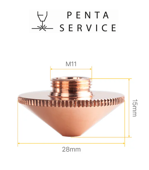 Сопло PENTA SERVICE высотой 15 мм, диаметром 28 мм, имеет диаметр отверстия 1,2 мм и резьбу М11, произведено из меди с соблюдением всех необходимых стандартов качества, технических и геометрических параметров изделий данного типа. В результате применения, сопло гарантирует сохранение расчётных параметров в течение длительного времени и обеспечивает высокую мощность работы оборудования лазерной резки.